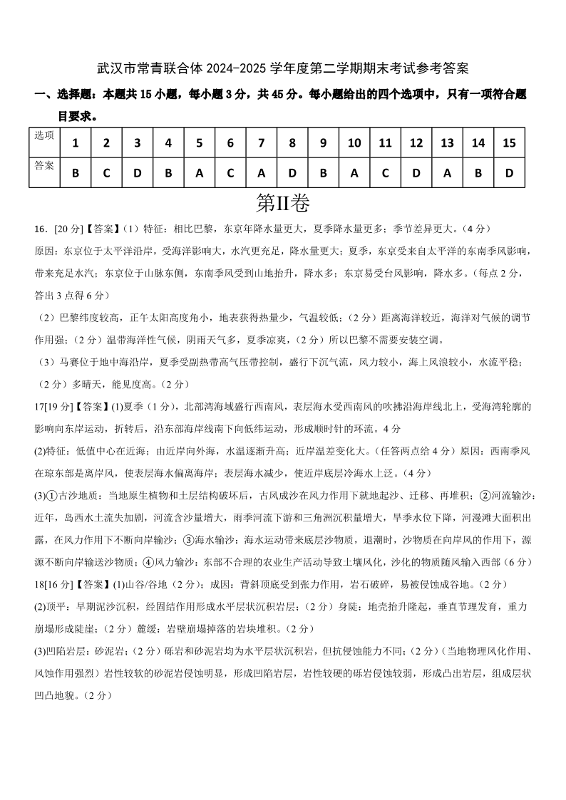 湖北省武汉市常青联盟2024-2025学年度下学期高一年级6月联考地理答案