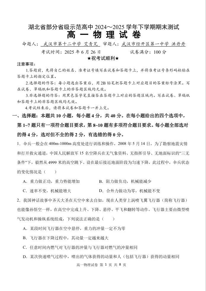 湖北省武汉市七彩联盟2024-2025学年度下学期高一年级6月联考物理