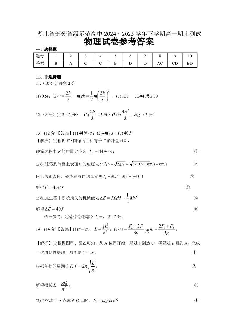 湖北省武汉市七彩联盟2024-2025学年度下学期高一年级6月联考物理答案