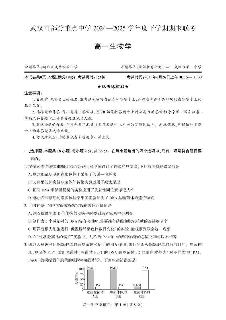 湖北省武汉市七彩联盟2024-2025学年度下学期高一年级6月联考生物