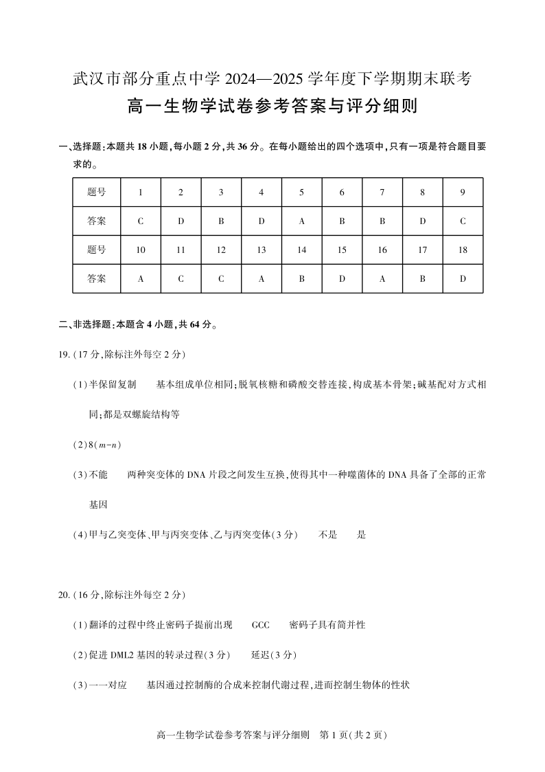 湖北省武汉市七彩联盟2024-2025学年度下学期高一年级6月联考生物答案