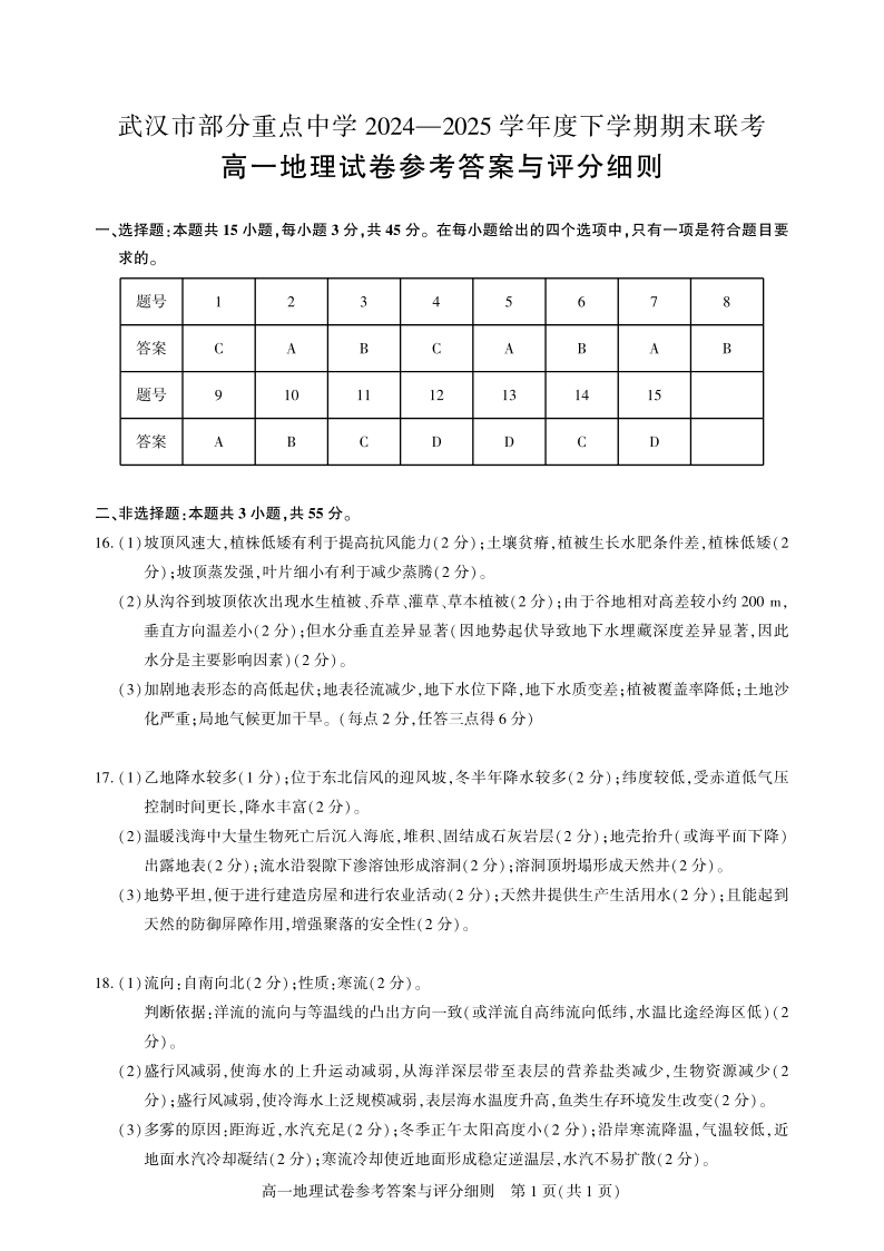 湖北省武汉市七彩联盟2024-2025学年度下学期高一年级6月联考地理答案