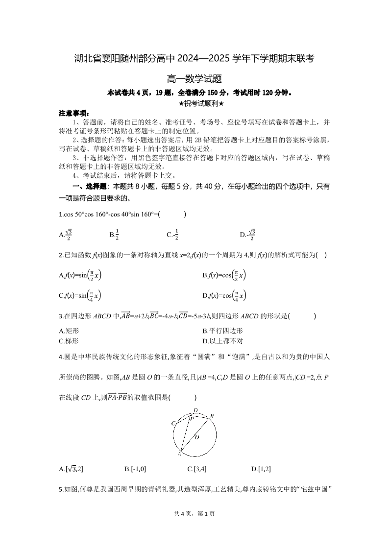 湖北省襄阳随州部分高中2024-2025学年高一下学期期末联考数学