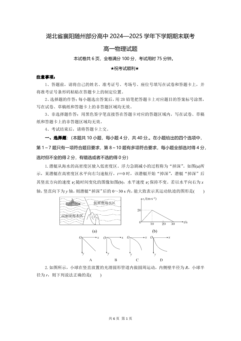 湖北省襄阳随州部分高中2024-2025学年高一下学期期末联考物理