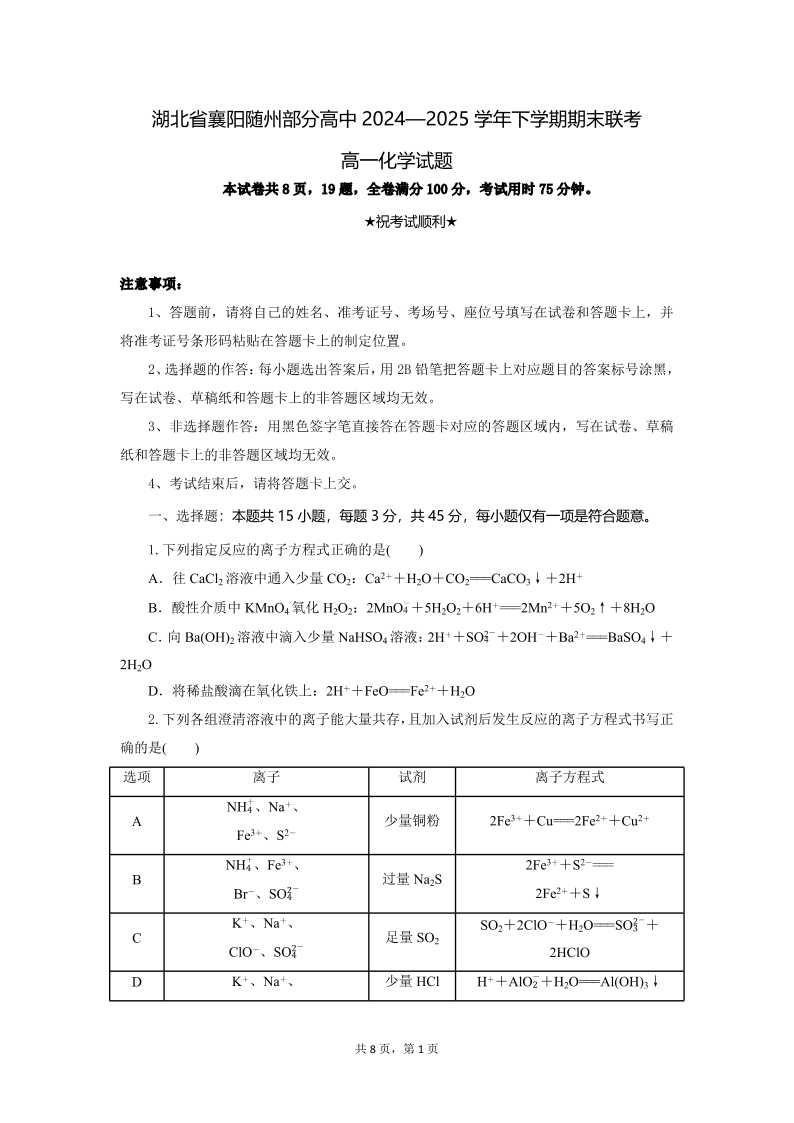 湖北省襄阳随州部分高中2024-2025学年高一下学期期末联考化学