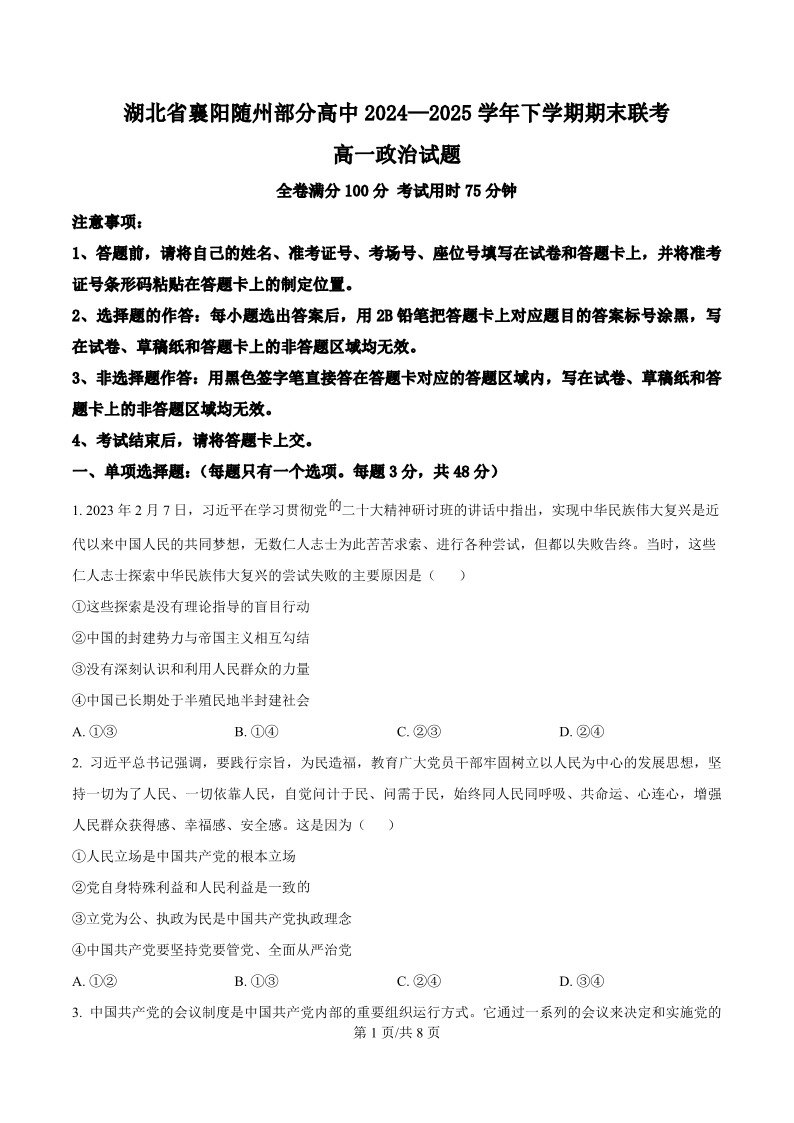 湖北省襄阳随州部分高中2024-2025学年高一下学期期末联考政治