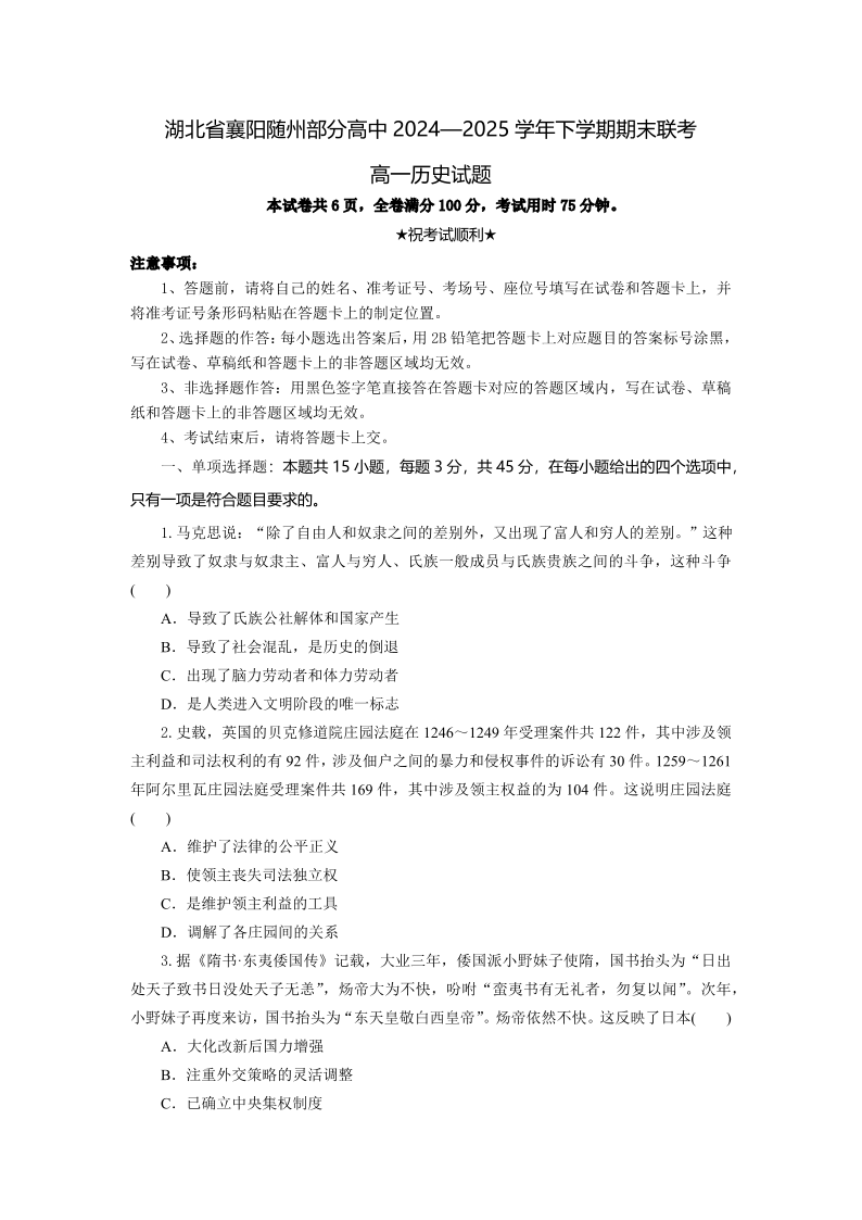 湖北省襄阳随州部分高中2024-2025学年高一下学期期末联考历史(原版卷)
