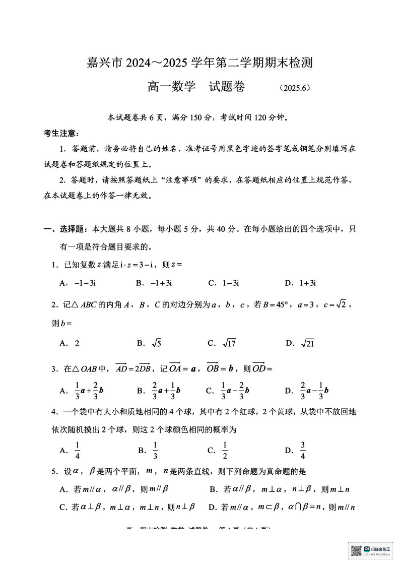 浙江嘉兴市2024-2025学年高一下学期期末测试数学+答案