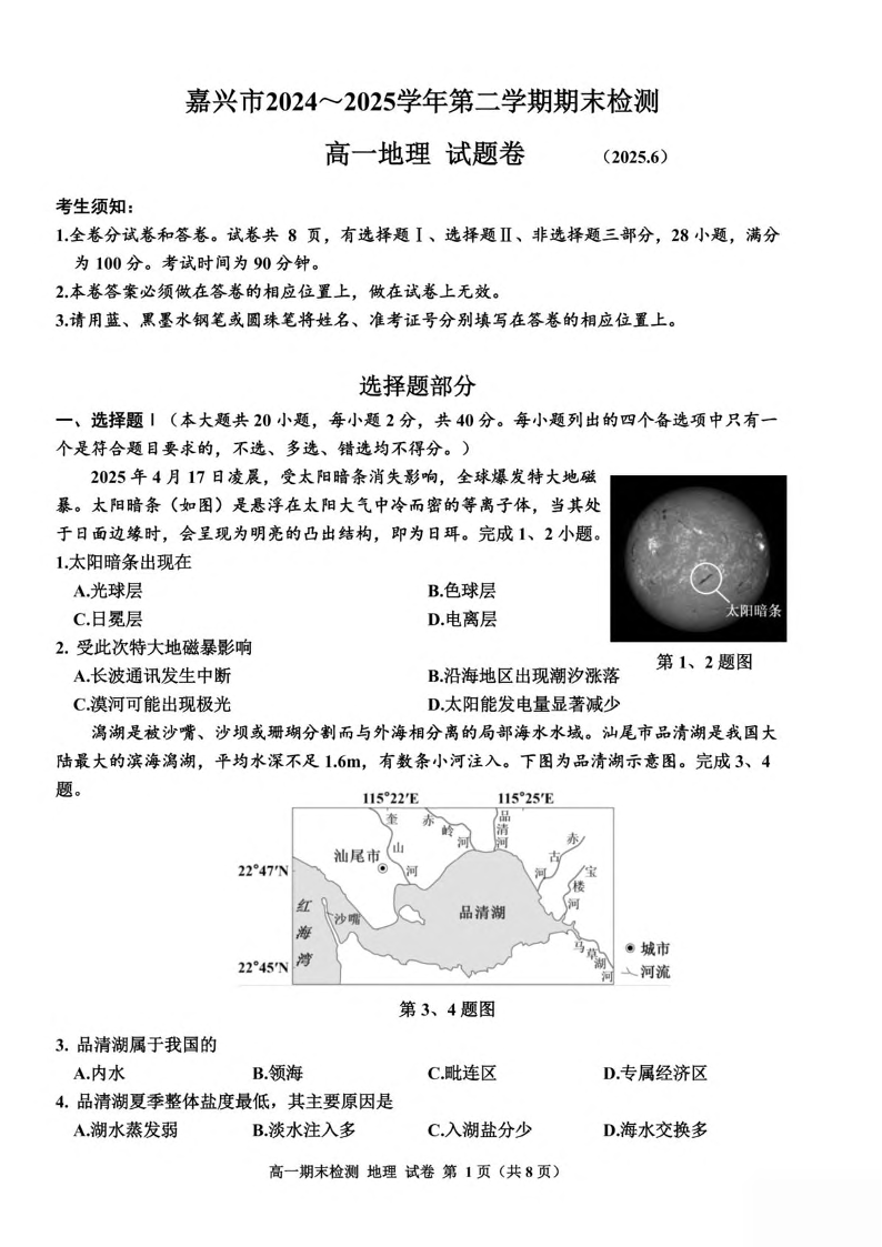 浙江嘉兴市2024-2025学年高一下学期期末测试地理+答案