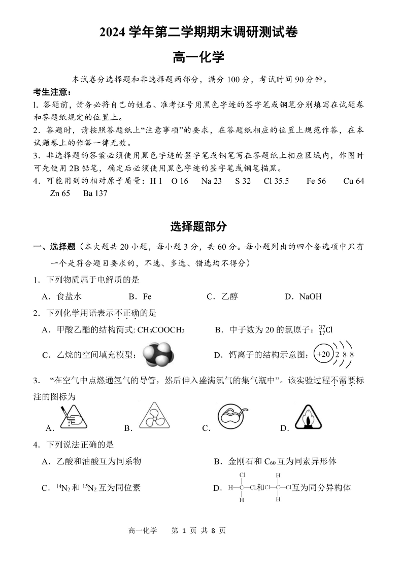 浙江省湖州市2024-2025学年高一下学期期末调研测试化学+答案