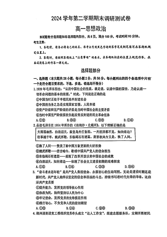 浙江省湖州市2024-2025学年高一下学期期末调研测试政治+答案
