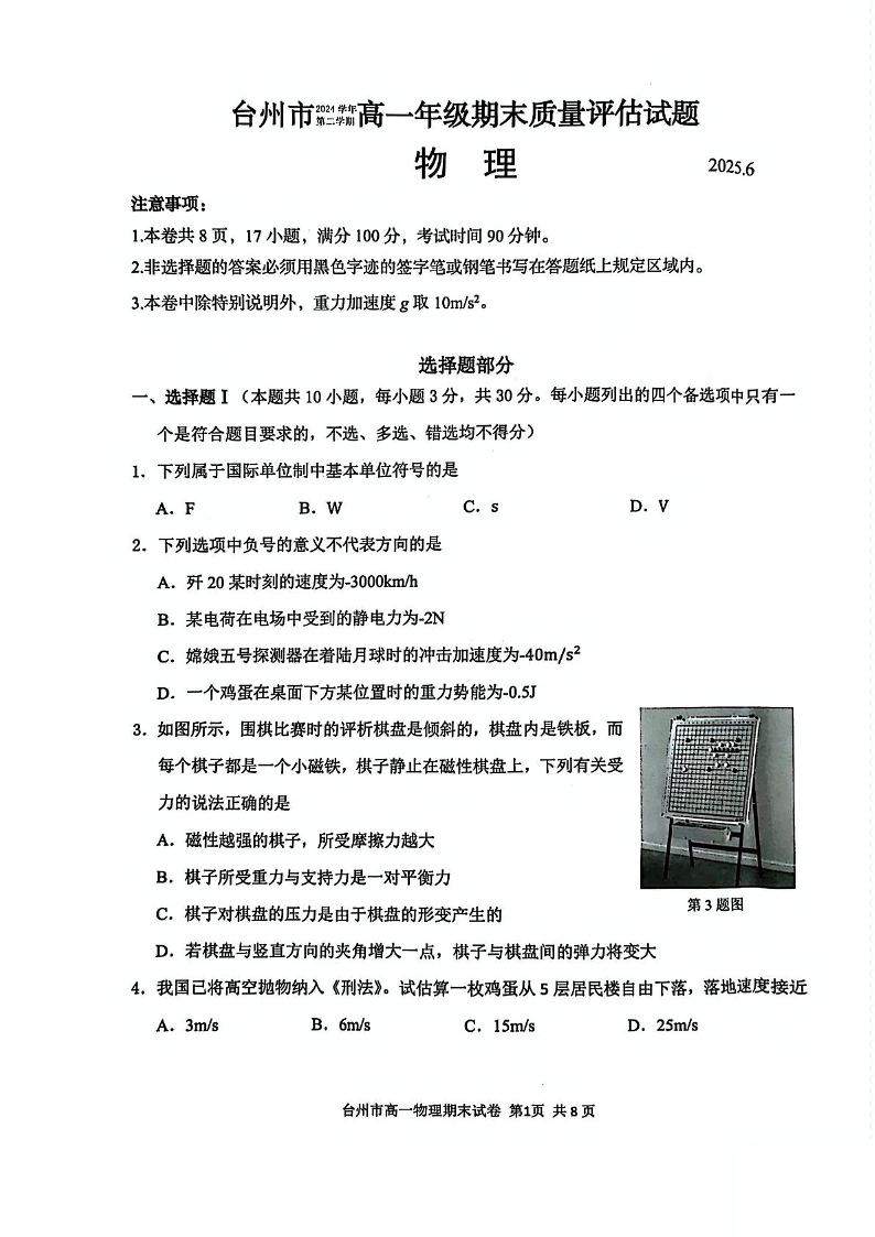 浙江台州市2024-2025学年高一下学期6月期末物理+答案