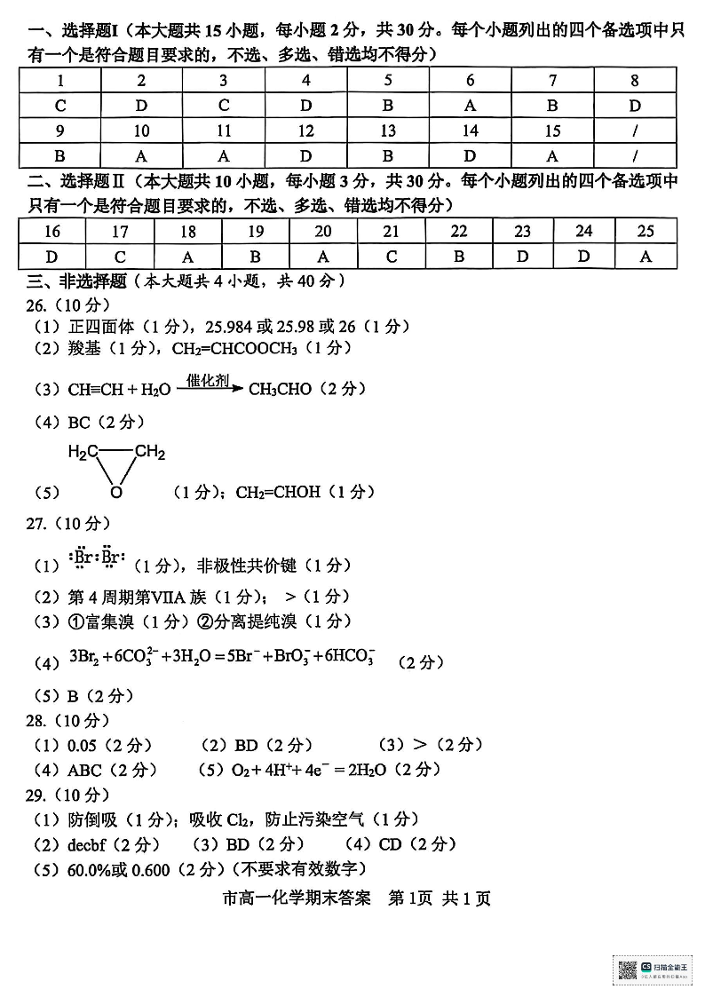浙江台州市2024-2025学年高一下学期6月期末化学答案