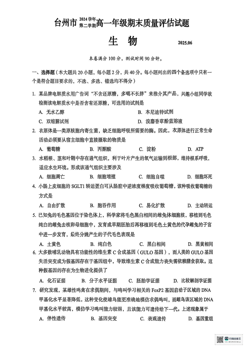 浙江台州市2024-2025学年高一下学期6月期末生物+答案