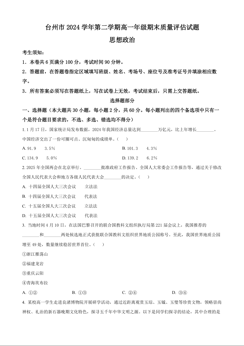 浙江台州市2024-2025学年高一下学期6月期末政治+答案