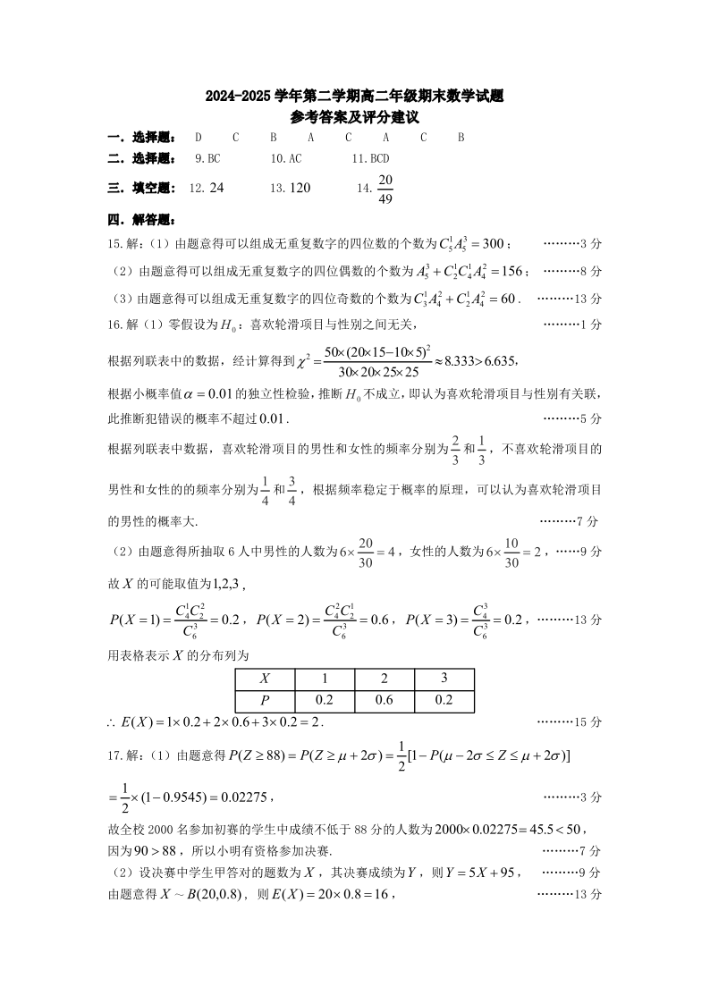 山西省太原市2024-2025学年高二下学期期末考试数学答案