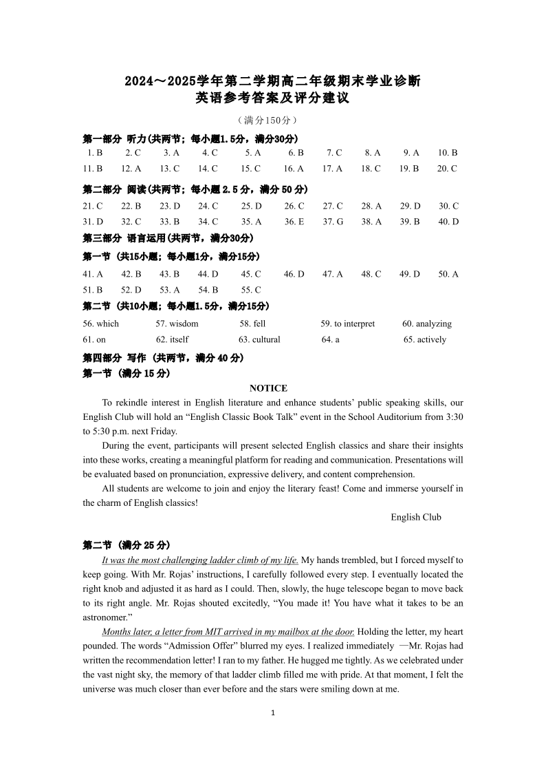 山西省太原市2024-2025学年高二下学期期末考试英语答案