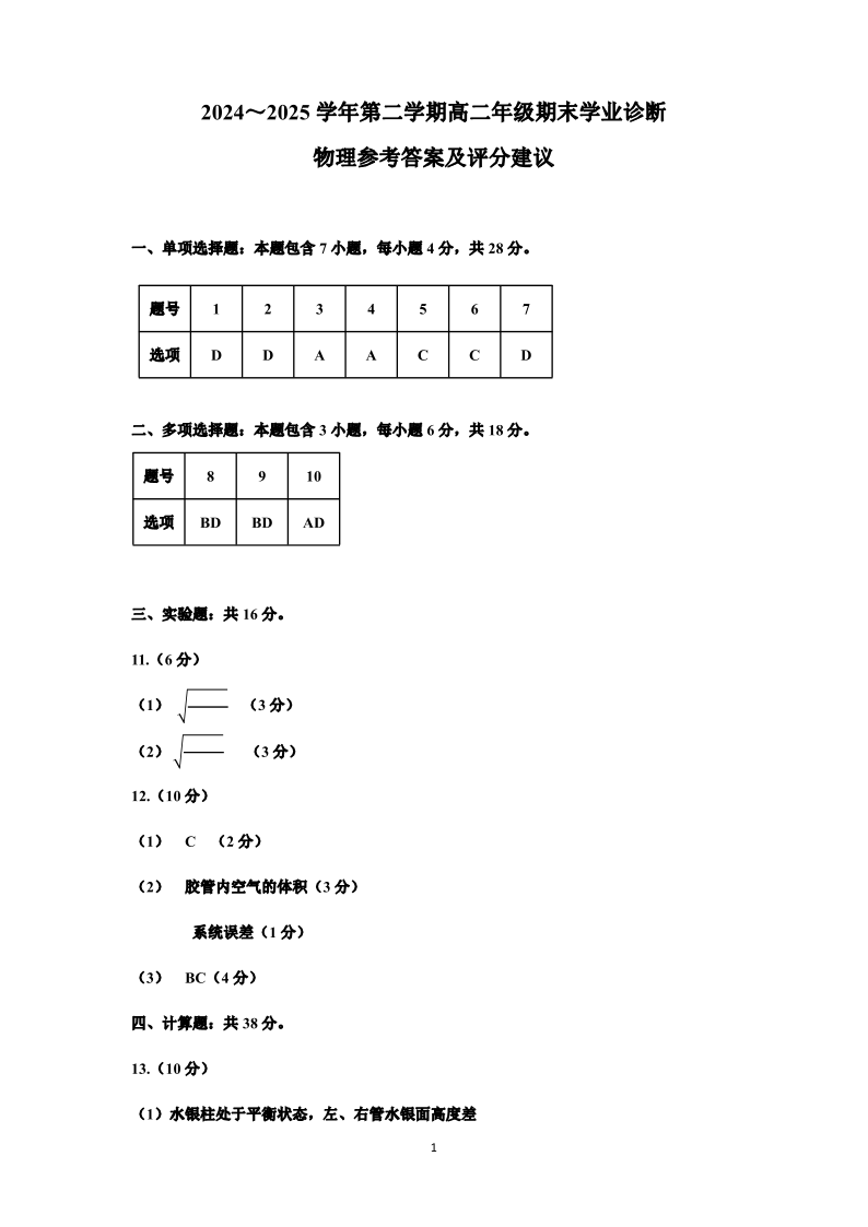 山西省太原市2024-2025学年高二下学期期末考试物理答案