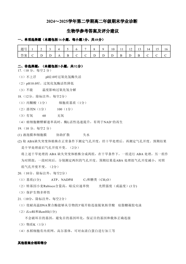 山西省太原市2024-2025学年高二下学期期末考试生物答案