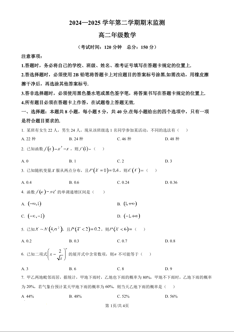 巴音郭楞蒙古自治州2024-2025学年高二下学期6月期末数学