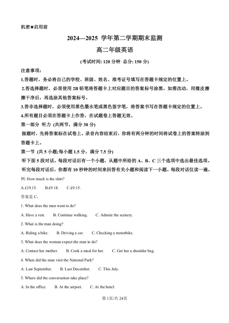 巴音郭楞蒙古自治州2024-2025学年高二下学期6月期末英语答案