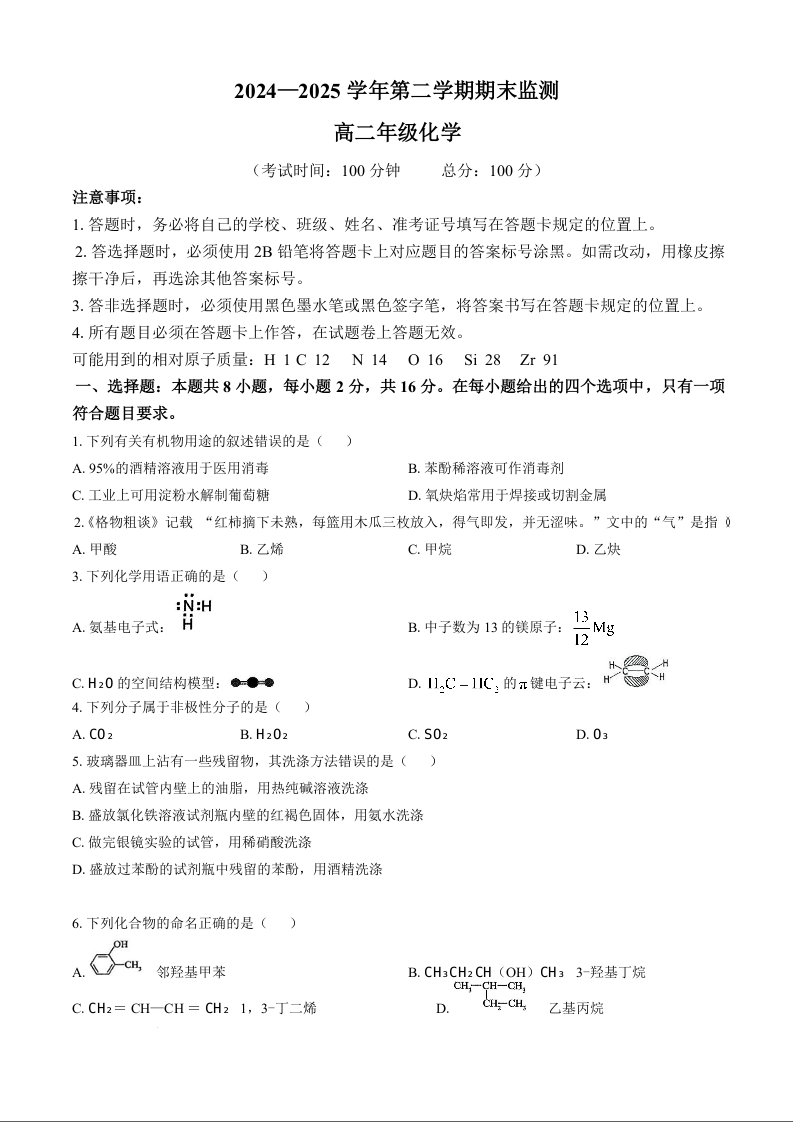 巴音郭楞蒙古自治州2024-2025学年高二下学期6月期末化学答案