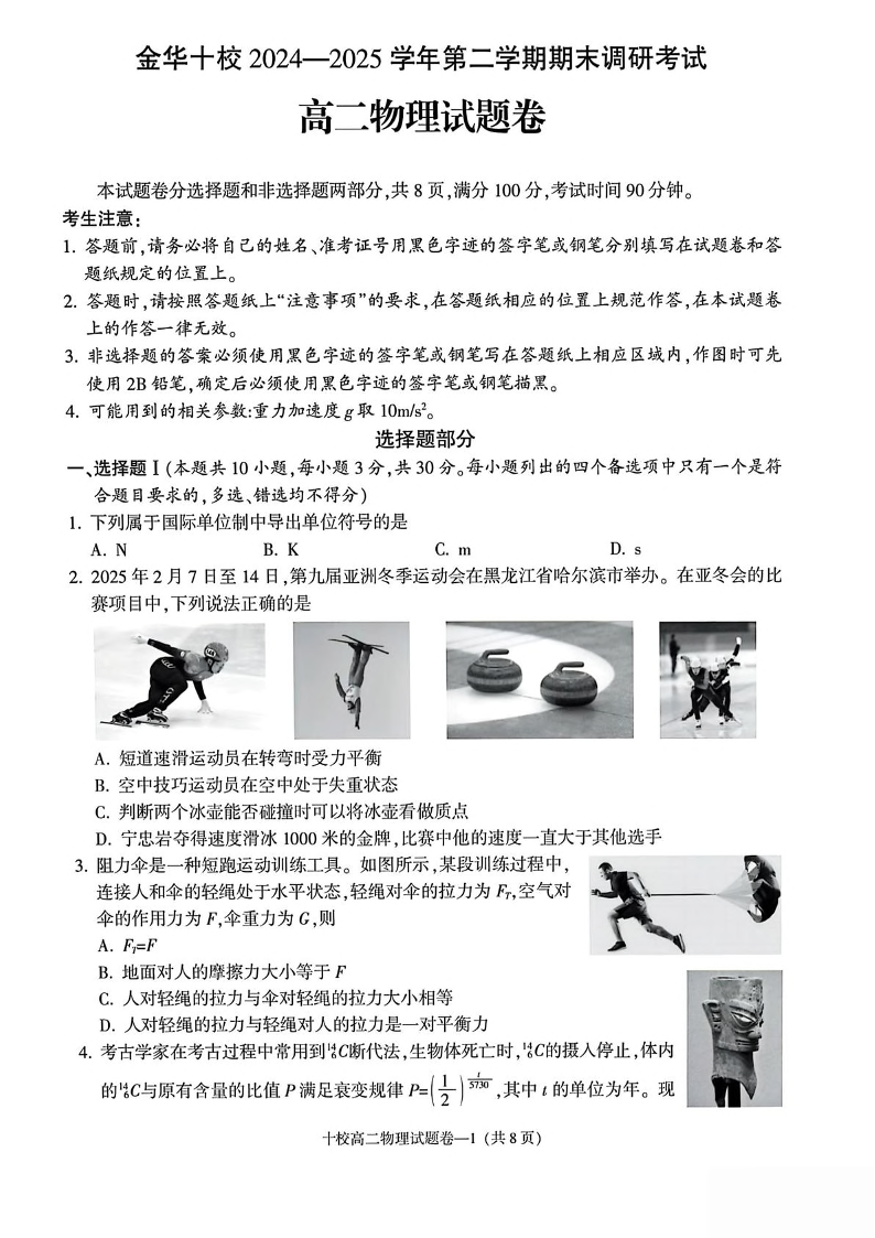 浙江省金华市十校2024-2025学年高二下学期6月期末调研考试物理+答案