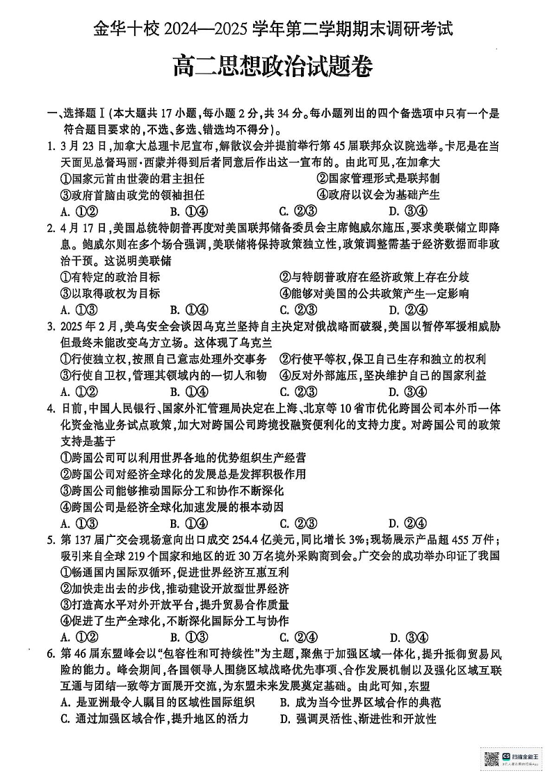 浙江省金华市十校2024-2025学年高二下学期6月期末调研考试政治+答案