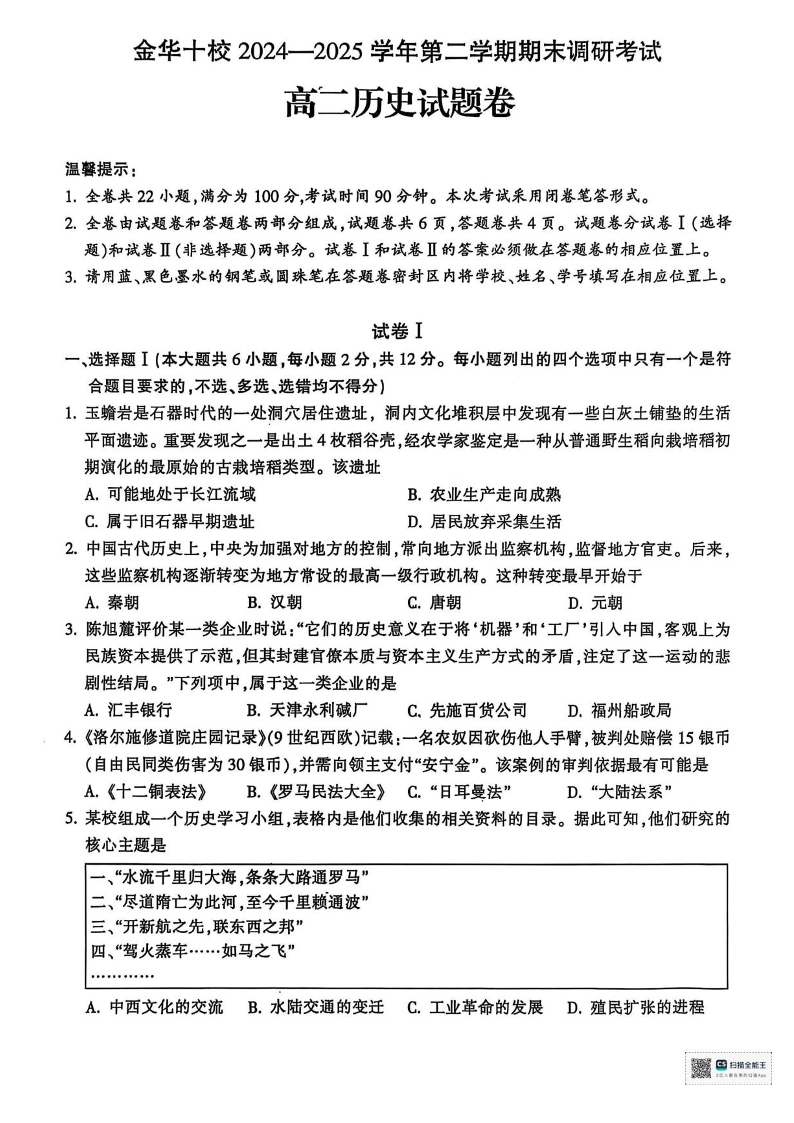 浙江省金华市十校2024-2025学年高二下学期6月期末调研考试历史+答案