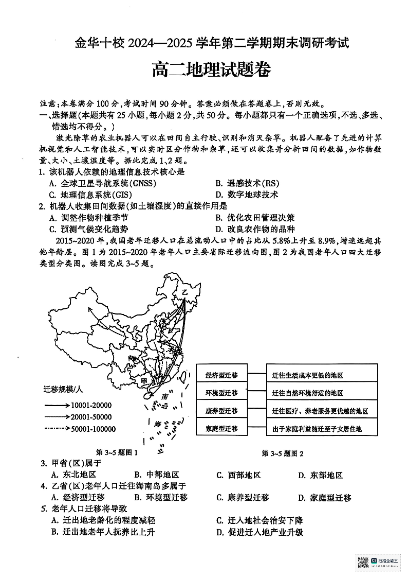 浙江省金华市十校2024-2025学年高二下学期6月期末调研考试地理+答案