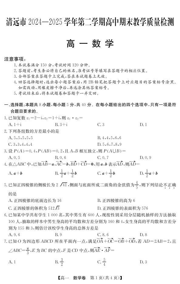 高一数学--广东省清远市2024-2025学年第二学期高一期末教学质检