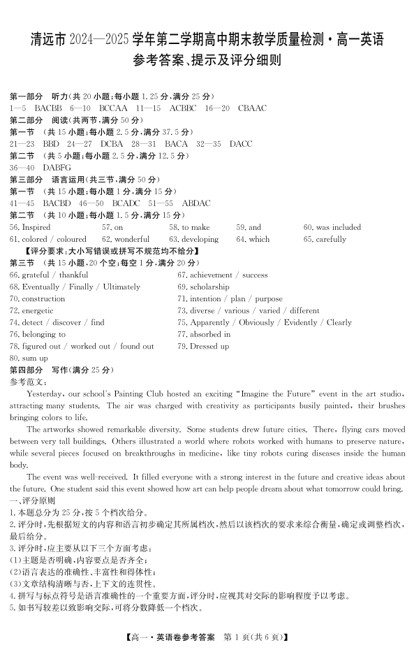 高一英语答案--广东省清远市2024-2025学年第二学期高一期末教学质检