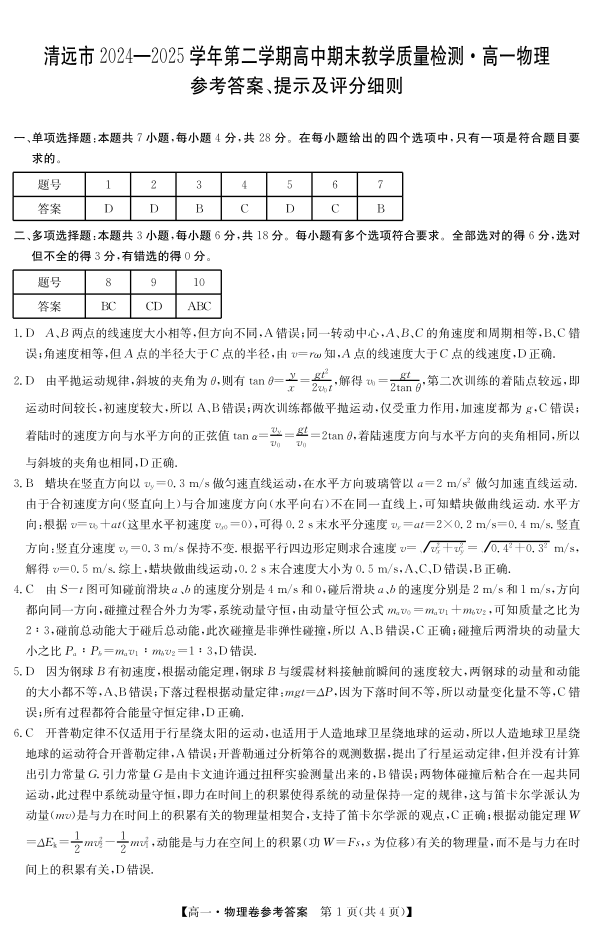 高一物理答案--广东省清远市2024-2025学年第二学期高一期末教学质检