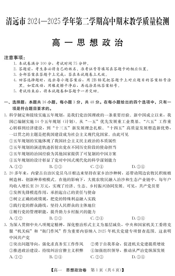 高一政治--广东省清远市2024-2025学年第二学期高一期末教学质检