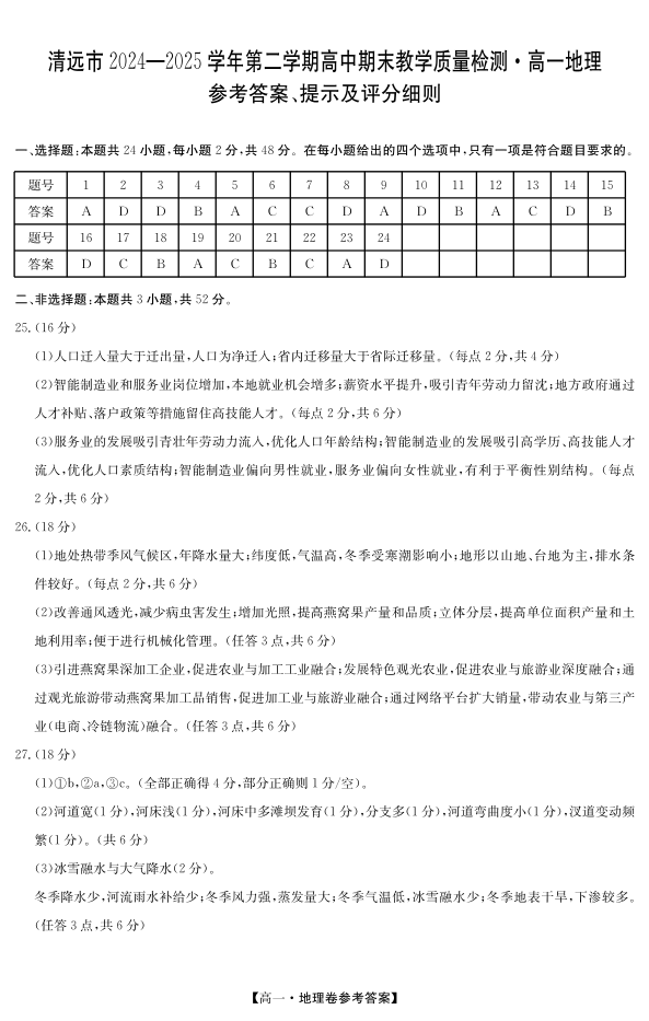 高一地理答案--广东省清远市2024-2025学年第二学期高一期末教学质检