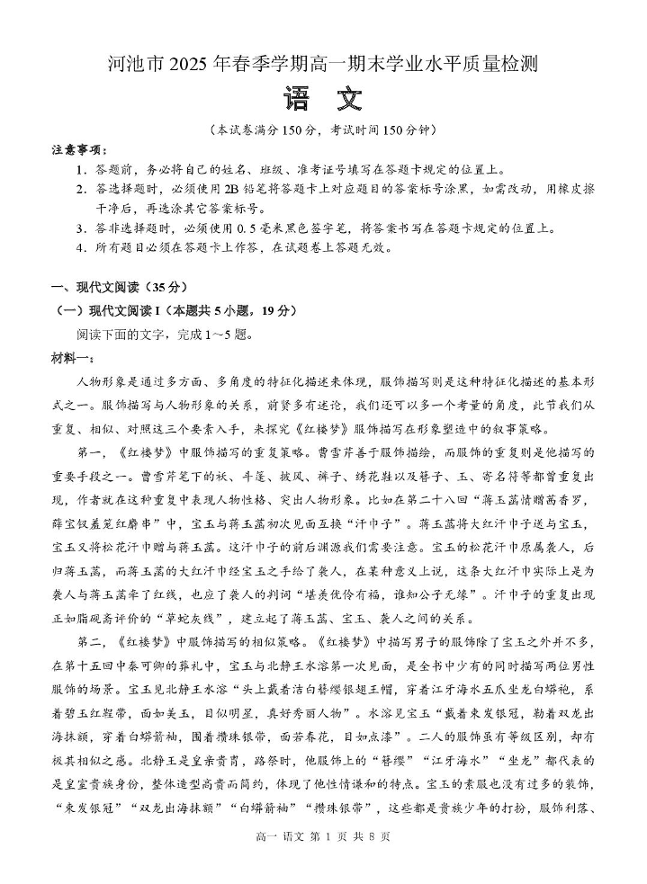 高一语文+答案--广西河池市2024-2025学年高一下学期7月期末考试