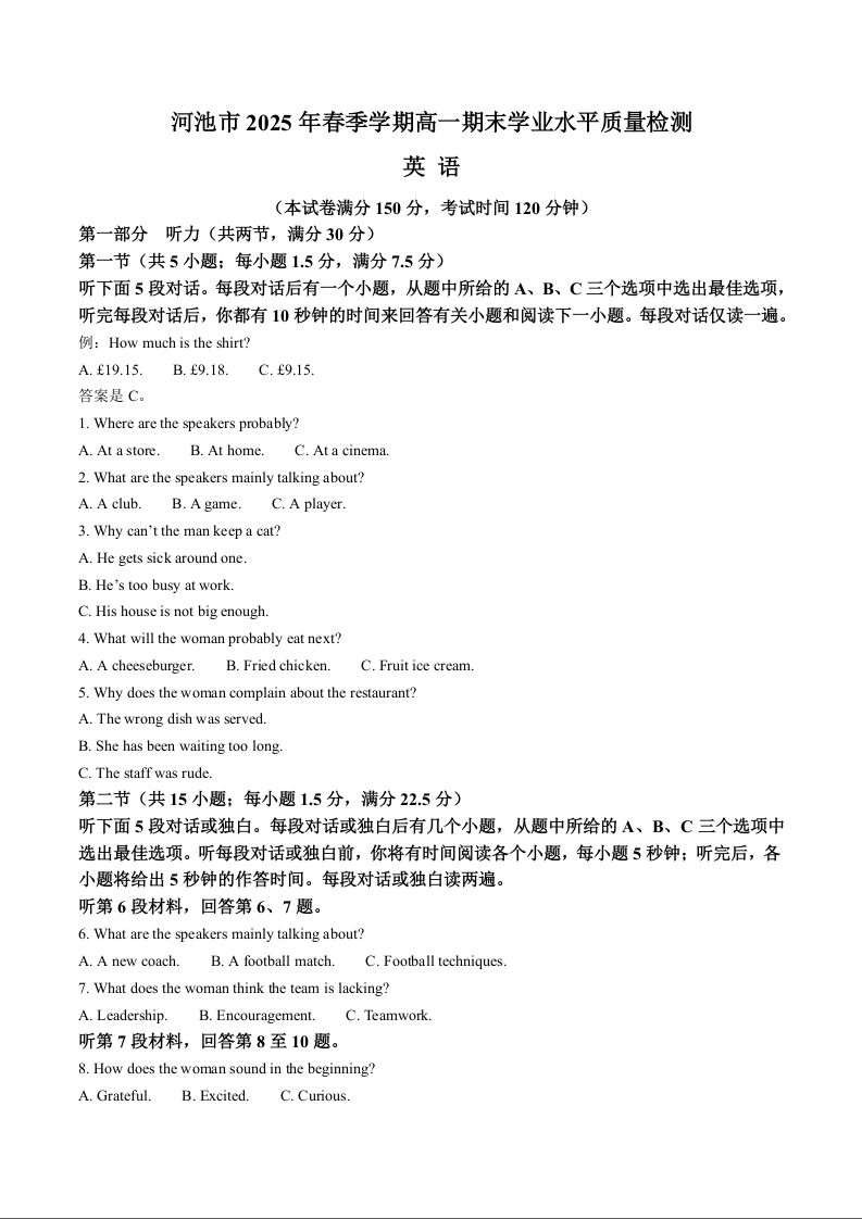 高一英语+答案--广西河池市2024-2025学年高一下学期7月期末考试