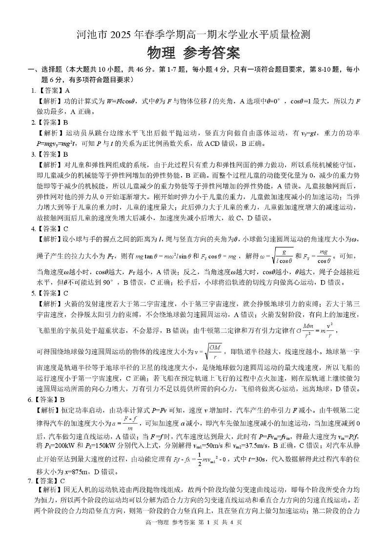 高一物理答案--广西河池市2024-2025学年高一下学期7月期末考试