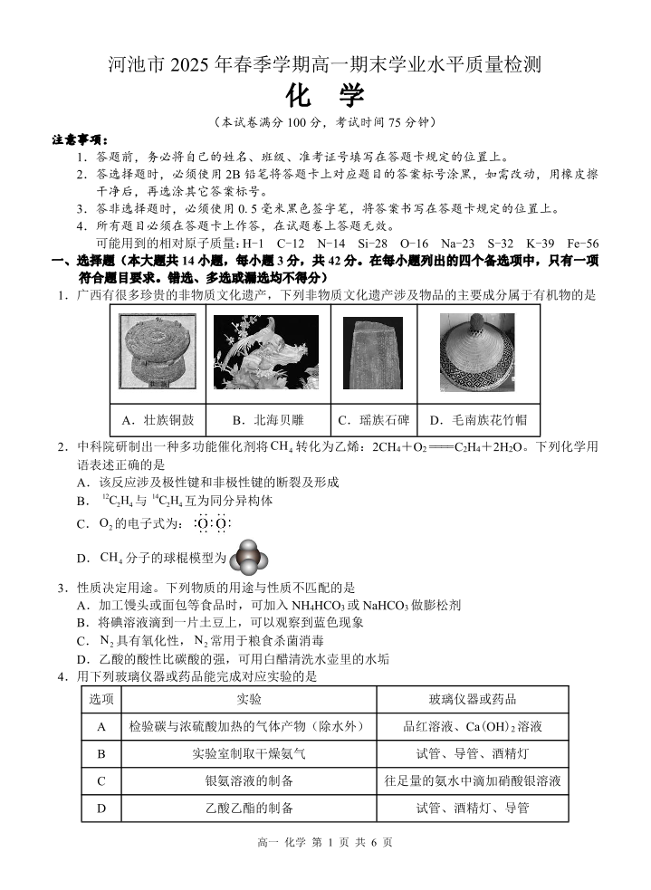 高一化学+答案--广西河池市2024-2025学年高一下学期7月期末考试
