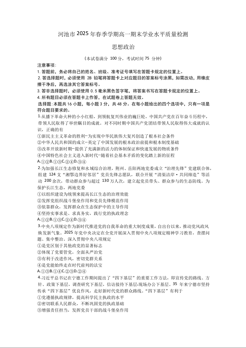 高一政治+答案--广西河池市2024-2025学年高一下学期7月期末考试