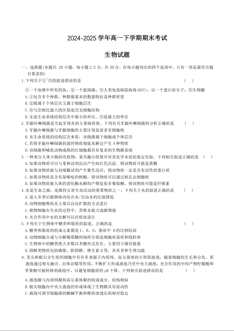 高一生物+答案--河北省邢台市名校联考2024-2025学年高一下学期7月期末