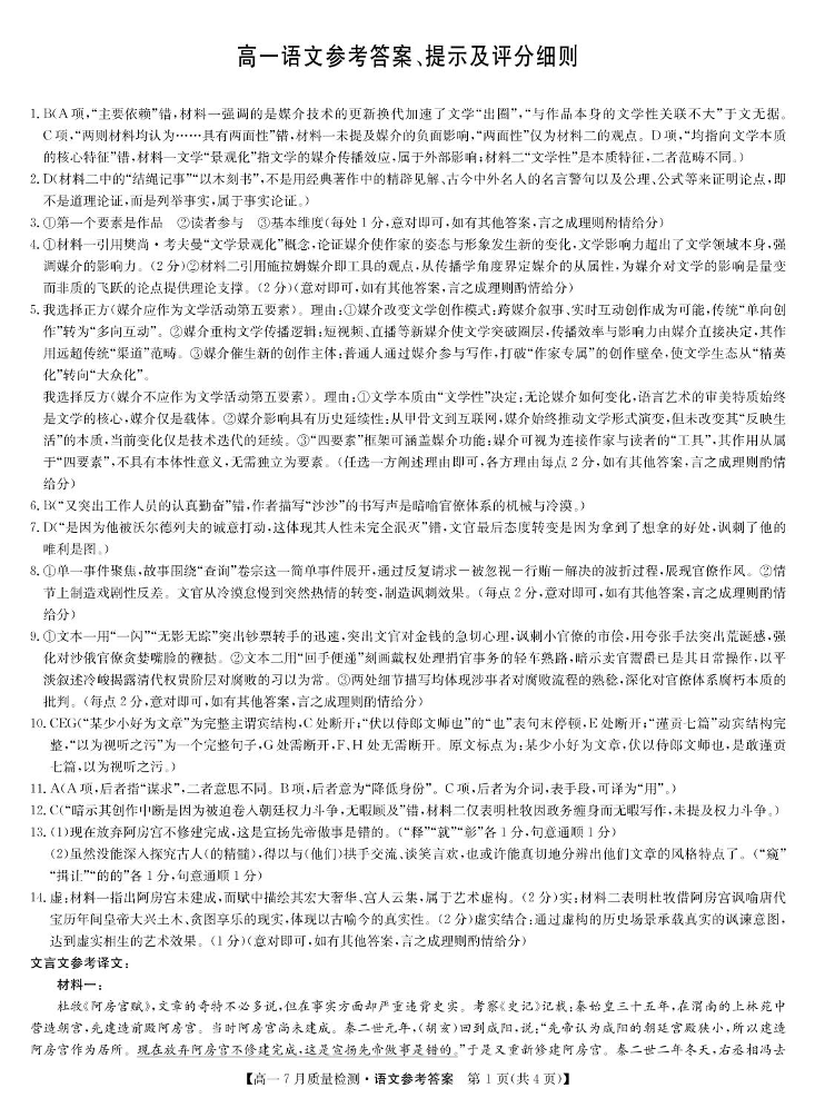 高一语文答案--江西省宜春市部分重点中学2024-2025学年高一下学期7月联考试题