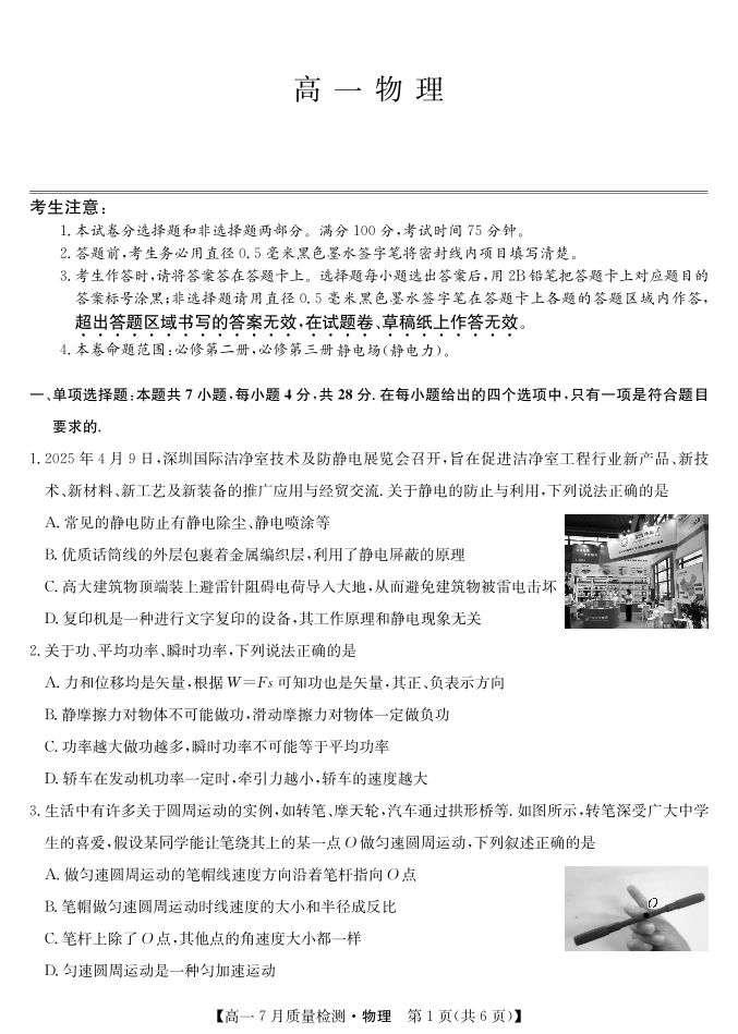 高一物理--江西省宜春市部分重点中学2024-2025学年高一下学期7月联考试题