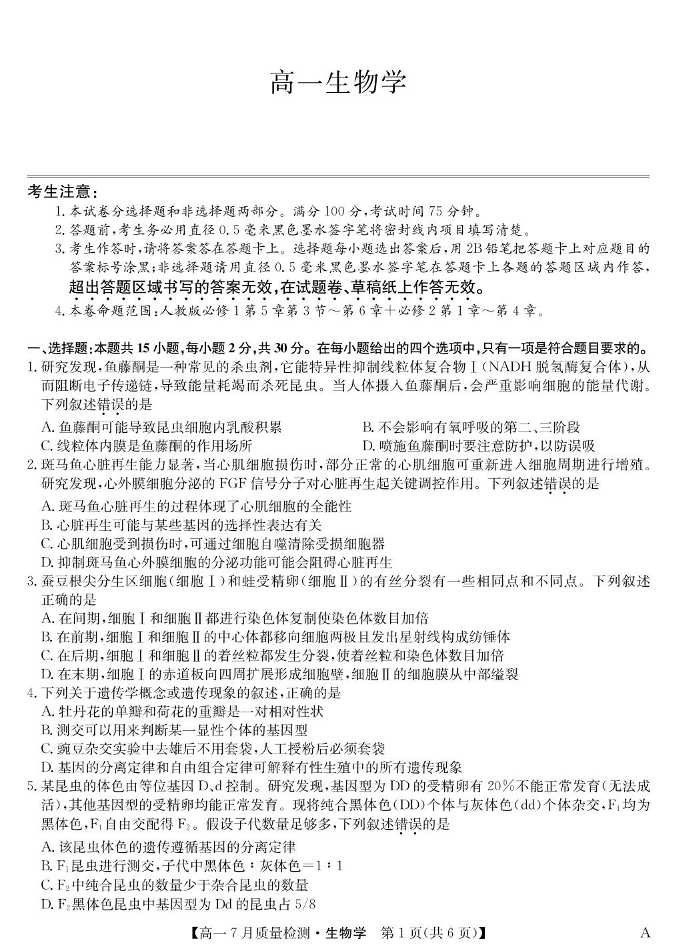 高一生物+答案--江西省宜春市部分重点中学2024-2025学年高一下学期7月联考试题