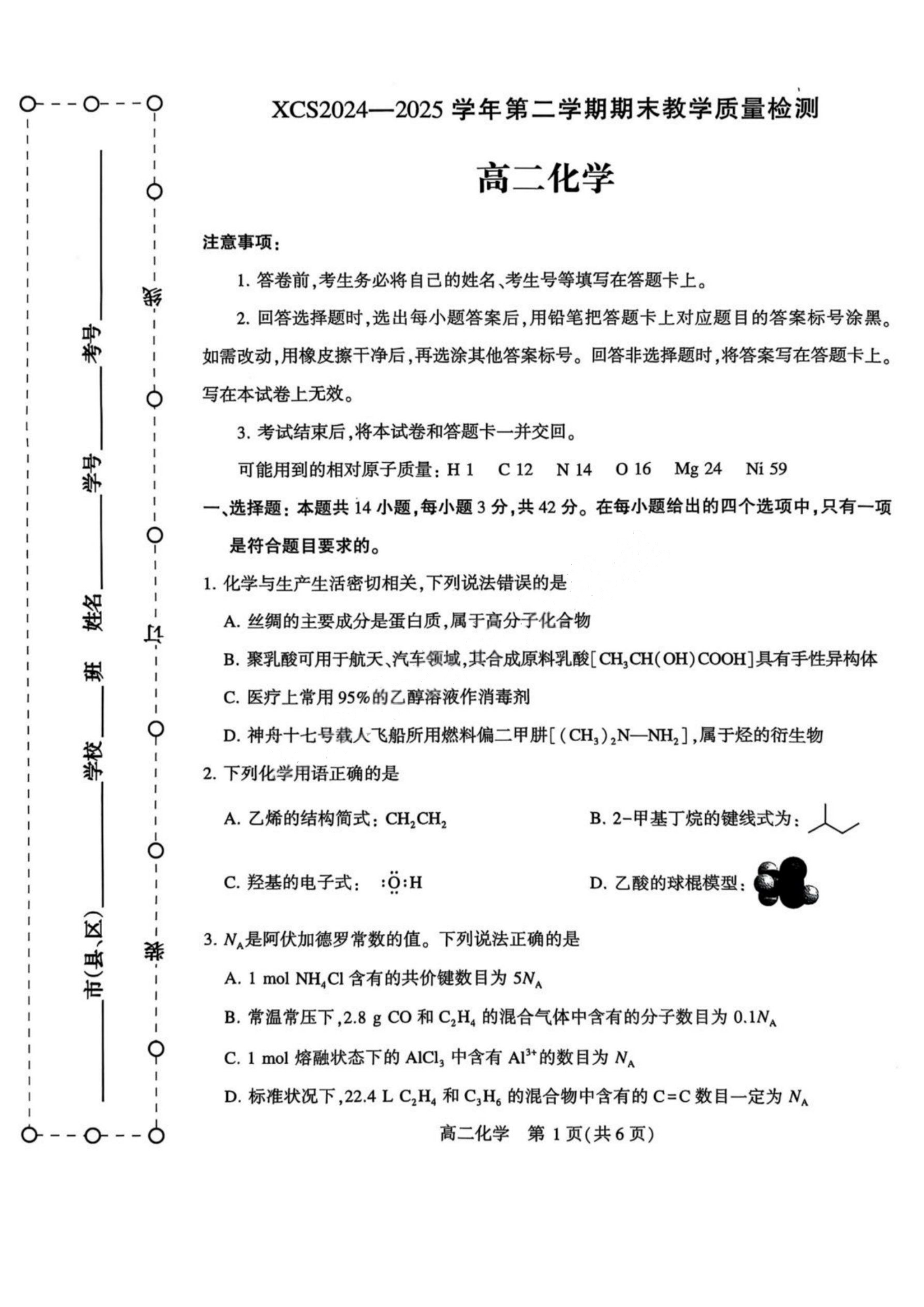 高二化学+答案--河南省许昌市XCS2024-2025学年第二学期高二期末教学质量检测