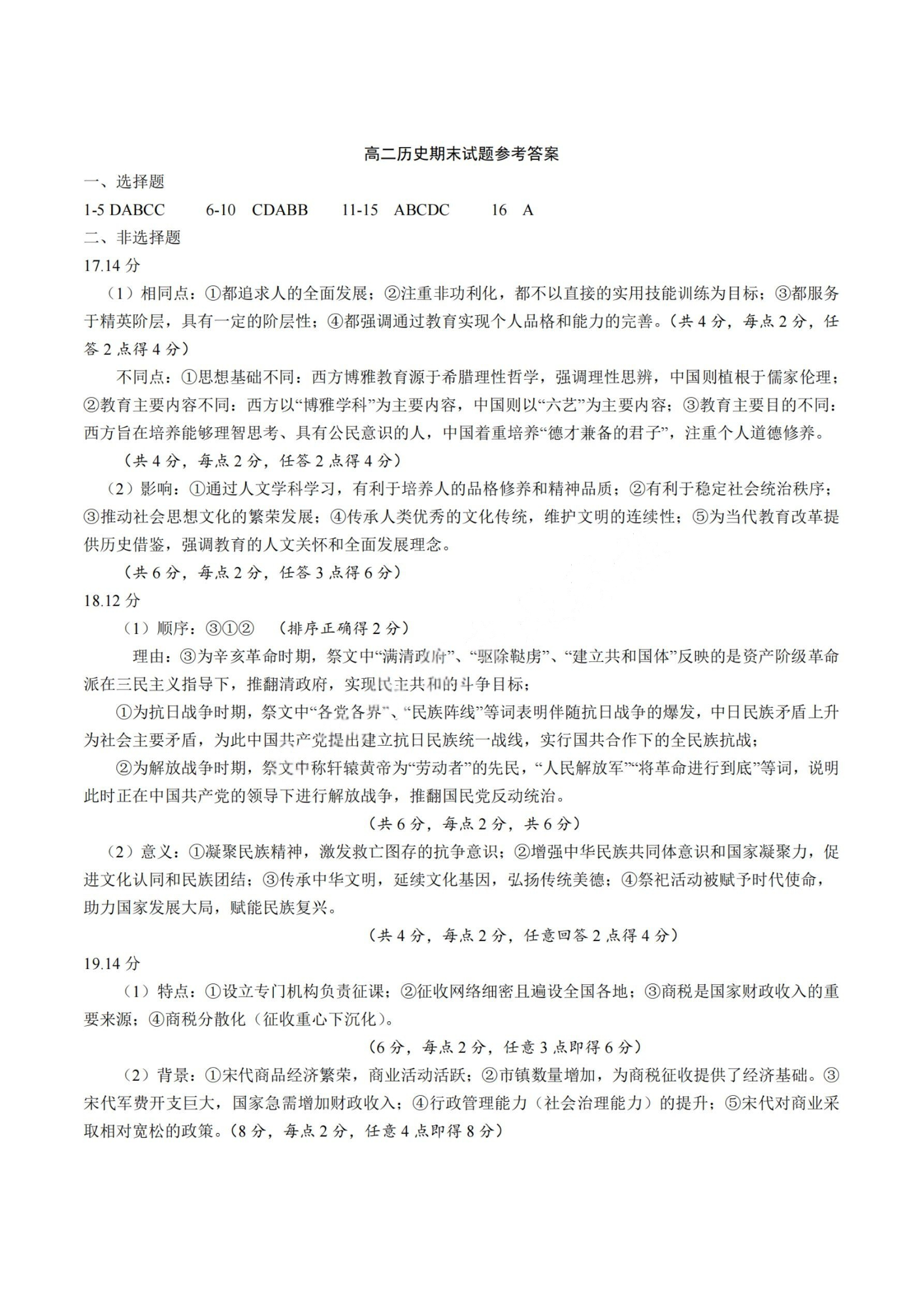 高二历史答案--河南省许昌市XCS2024-2025学年第二学期高二期末教学质量检测