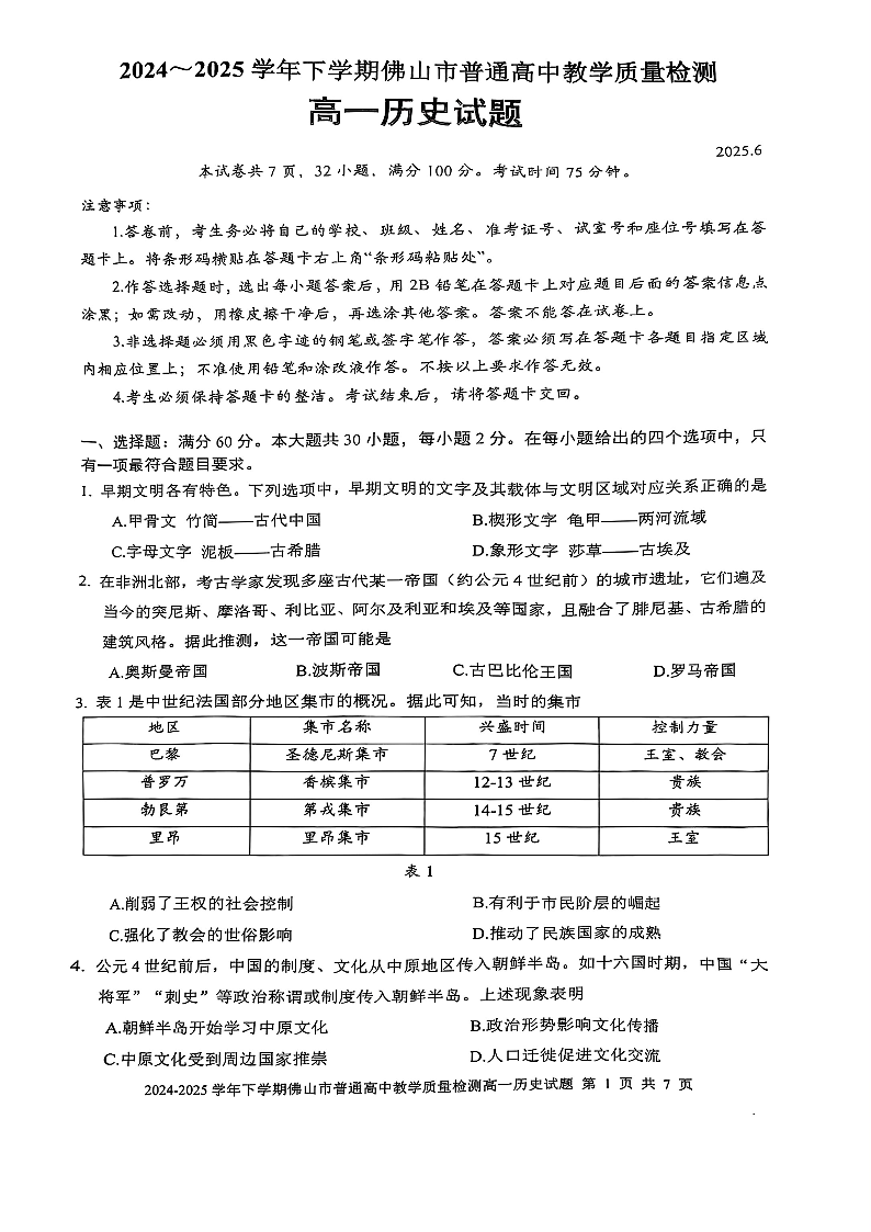 广东省佛山市2024-2025学年高一下学期6月期末历史+答案