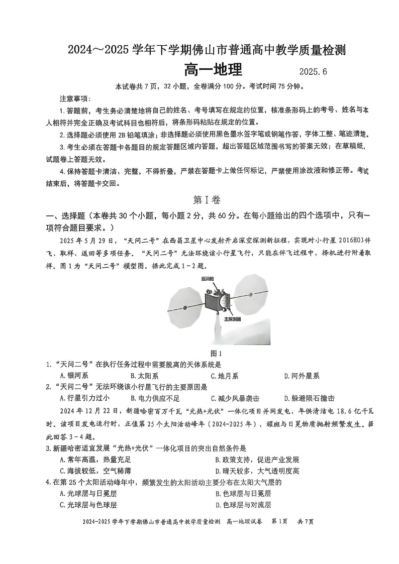 广东省佛山市2024-2025学年高一下学期6月期末地理+答案