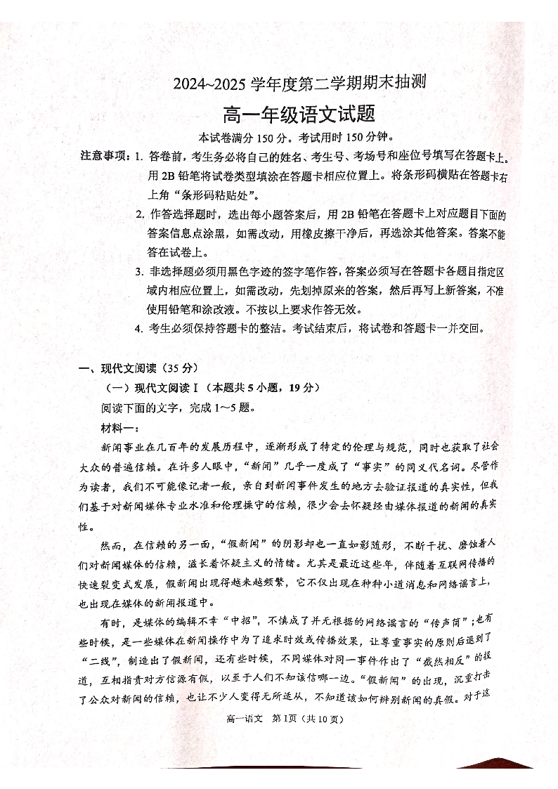 江苏省徐州市2024-2025学年高一下学期期末考试语文