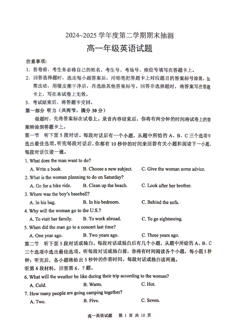 江苏省徐州市2024-2025学年高一年级下学期期末考试英语+答案